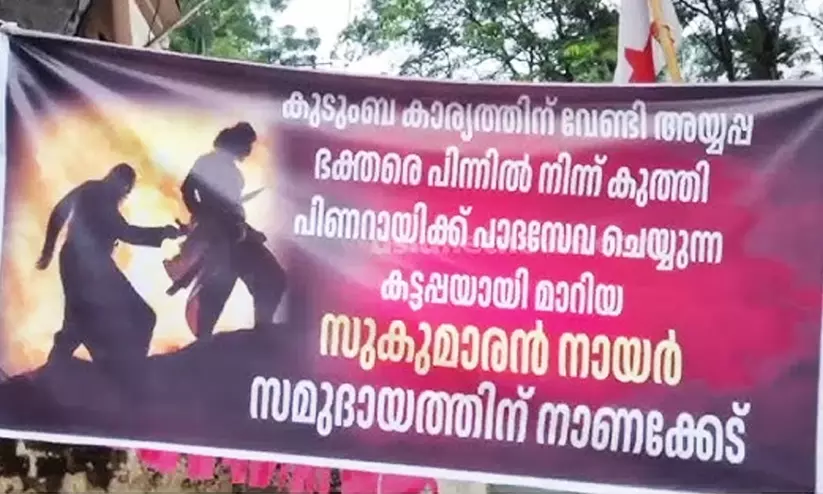 സുകുമാരൻ നായർ സമുദായത്തിന് നാണക്കേടെന്നും ബാനറിൽ പരിഹസിക്കുന്നുണ്ട്. ബാഹുബലിയെ കട്ടപ്പ പിന്നിൽ നിന്ന് കുത്തുന്ന ചിത്രവും കൊടുത്തിട്ടുണ്ട്. കഴിഞ്ഞ ദിവസം വെട്ടിപ്പുറം എൻ.എസ്.എസ് കരയോഗ കെട്ടിടത്തിന് മുന്നിലും ഇതേ വാചകങ്ങളോടെ ബാനർ പ്രത്യക്ഷപ്പെട്ടിരുന്നു.