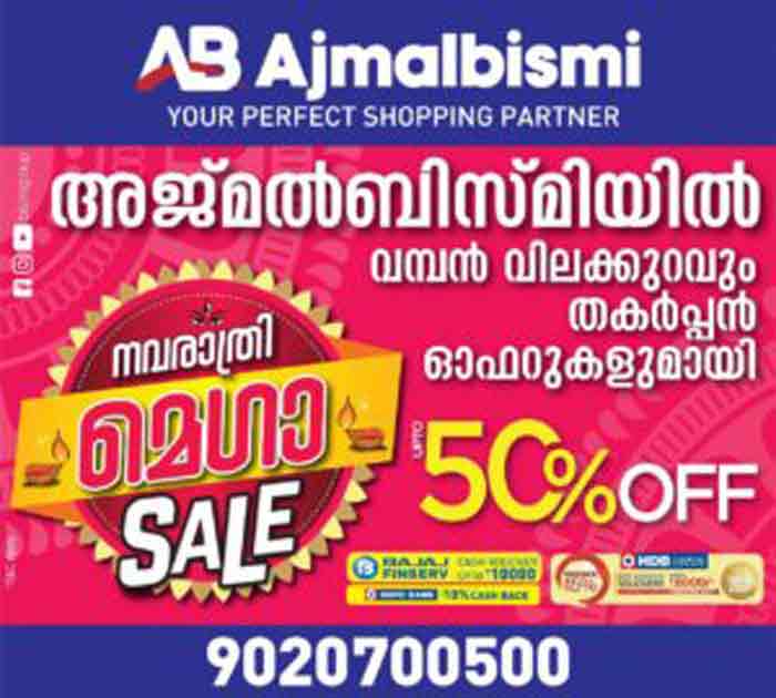 മികച്ച വിൽപ്പന – വിൽപ്പനാന്തര സേവനങ്ങളാണ് അജ്മൽ ബിസ്മിയുടെ പ്രധാന സവിശേഷത. പ്രമുഖ ബ്രാന്റുകളുടെ ഹോം അപ്ലയൻസുകളും ഡിജിറ്റൽ ഗാഡ്ജെറ്റ്സും മറ്റാരും നൽകാത്ത ഓഫറുകളോടെ നവരാത്രി സെയിലിന്റെ ഭാഗമായി സ്വന്തമാക്കാം. ബ്രാന്റഡ് സ്മാർട്ട് ടിവികളുടെ മികച്ച കളക്ഷനും, പ്രമുഖ ബ്രാൻറുകളുടെ സ്മാർട്ട്ഫോണുകൾ, ലാപ്ടോപ്പുകൾ, പേഴ്സണൽ ഗാഡ്ജെറ്റ്സ് എന്നിവയും, മികച്ച പെർഫോമൻസ് ഉറപ്പാക്കുന്ന ബ്രാന്റഡ് വാഷിങ്ങ് മെഷീനുകളും റെഫ്രിജറേറ്ററുകളും ഒപ്പം വൈദ്യുതി ചിലവുകുറഞ്ഞ സ്റ്റാർ റേറ്റഡ് ഇൻവെർട്ടർ എസികളും എല്ലാം നവരാത്രി മെഗാ സെയിലിൽ ഏറ്റവും കുറഞ്ഞ വിലയിൽ ലഭിക്കുമെന്നും മാനേജ്മെന്റ് അറിയിച്ചു .