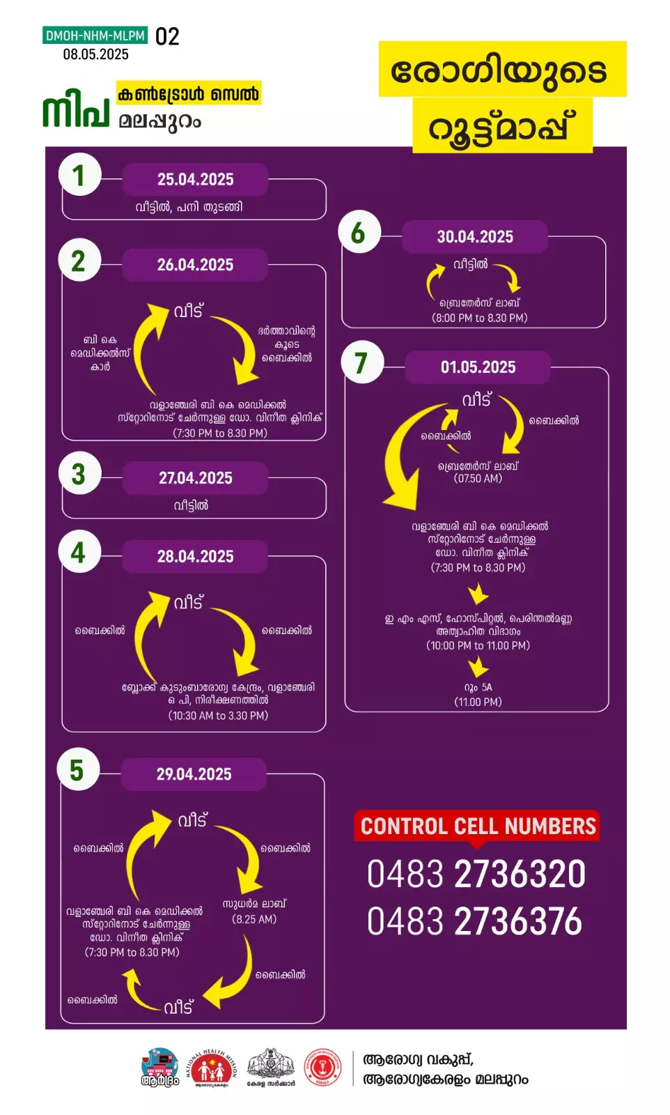 രോഗിയുടെ റൂട്ട്മാപ്പ് ആരോഗ്യവകുപ്പ് പുറത്തുവിട്ടിട്ടുണ്ട്. 12 കുടുംബാംഗങ്ങൾ ഉൾപ്പെടെ 49പേരാണ് സമ്പർക്കപട്ടികയിലുള്ളത്. ആറുപേർക്കാണ് രോഗലക്ഷണമുള്ളത്. ഇതിൽ അഞ്ചുപേർ മഞ്ചേരി മെഡി.കോളജിൽ ചികിത്സയിലാണ്.ഒരാൾ എറണാകുളത്ത് ഐസൊലേഷനിൽ കഴിയുകയാണ്.